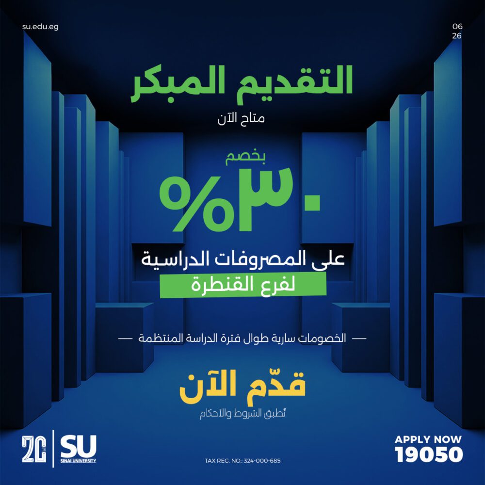 تتشرف جامعة سيناء بالترحيب بجميع الطلاب الذين اجتازوا المرحلة الثانوية والذين يرغبون في الالتحاق بجامعتنا في حرم القنطرة وحرم العريش. يعد التقديم للالتحاق بجامعة سيناء أمرًا تنافسيًا للغاية نظرًا لمحدودية عدد الأماكن المتاحة كل عام. يرجى تقديم طلب مبكرًا واستيفاء ما يلي لزيادة فرصتك في الانضمام إلينا.