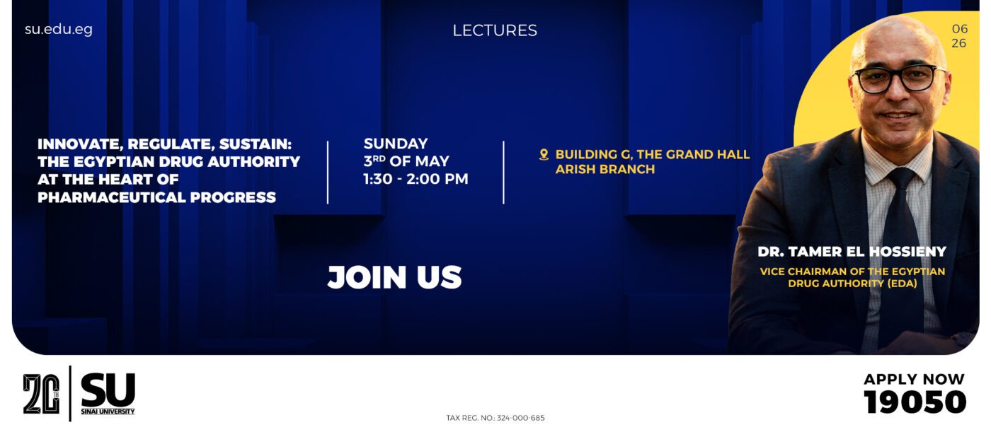 Under the gracious patronage of Prof. Dr. Gehan Fekry, President of Sinai University; Prof. Dr. Abdelhamid Abdo, Vice President for Education and Student Affairs; and Prof. Dr. Lotfy Diab, Dean of the Faculty of Pharmacy and Conference President.