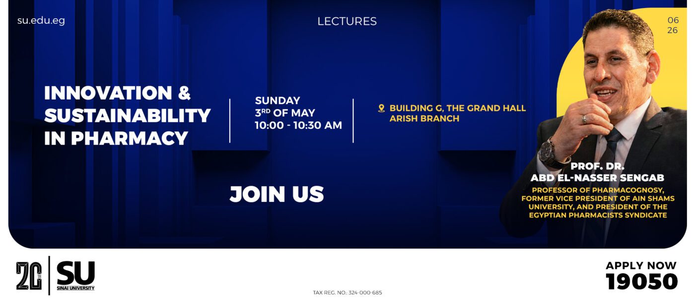 The Faculty of Pharmacy, Sinai University – Arish Branch, is organizing the Second Scientific Conference under the title “Pharmacy Between Innovation and Sustainability” within the framework of Egypt Vision 2030.