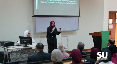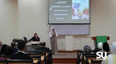 Under the generous patronage of Prof. Dr. Gehan Fekry, President of Sinai University, and Prof. Dr. Abdel Hamid Abdo, Vice President for Education and Student Affairs, Arish Branch, and in the presence of Prof. Dr. Lotfy Diab, Dean of the Faculty, Prof. Dr. Mostafa Hegazy, Vice Dean of the Faculty, the Training and Internship Unit at the Faculty of Pharmacy, along with esteemed faculty members and their assistants, the presentation of distinguished applied research projects by internship pharmacists from the first compulsory training cycle was held on Monday, November 10, 2025.