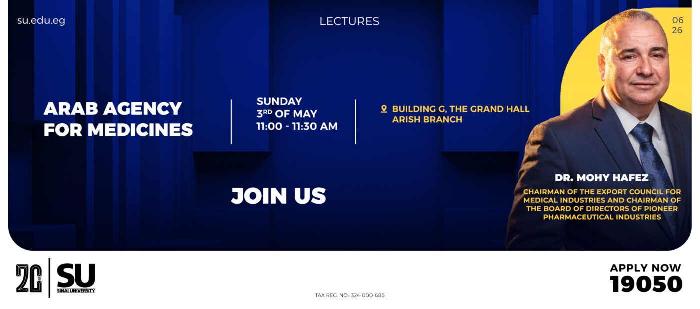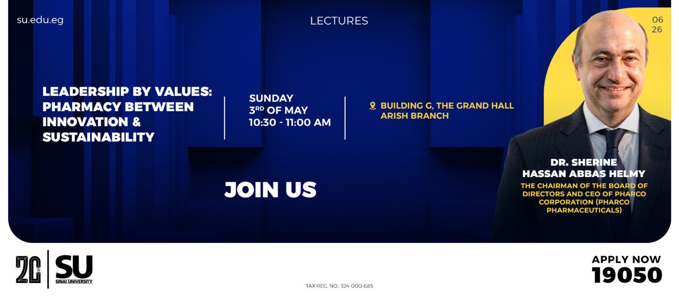 Under the gracious patronage of Prof. Dr. Gehan Fekry, President of Sinai University; Prof. Dr. Abdelhamid Abdo, Vice President for Education and Student Affairs; and Prof. Dr. Lotfy Diab, Dean of the Faculty of Pharmacy and Conference President.