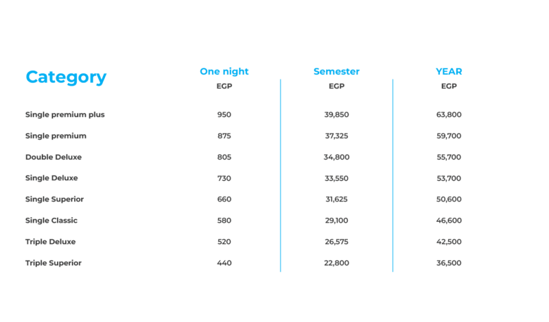 SU provides dorms for students to live in for each semester until they graduate. The rooms are fully finished and furnished. The dorms allow our students to be on campus 24/7 and are only a few walking minutes away from their classes. All dorms include AC and a study corner within the room. Of course, it’s up to the student to have a room on their own, or a shared room with one other colleague or two.